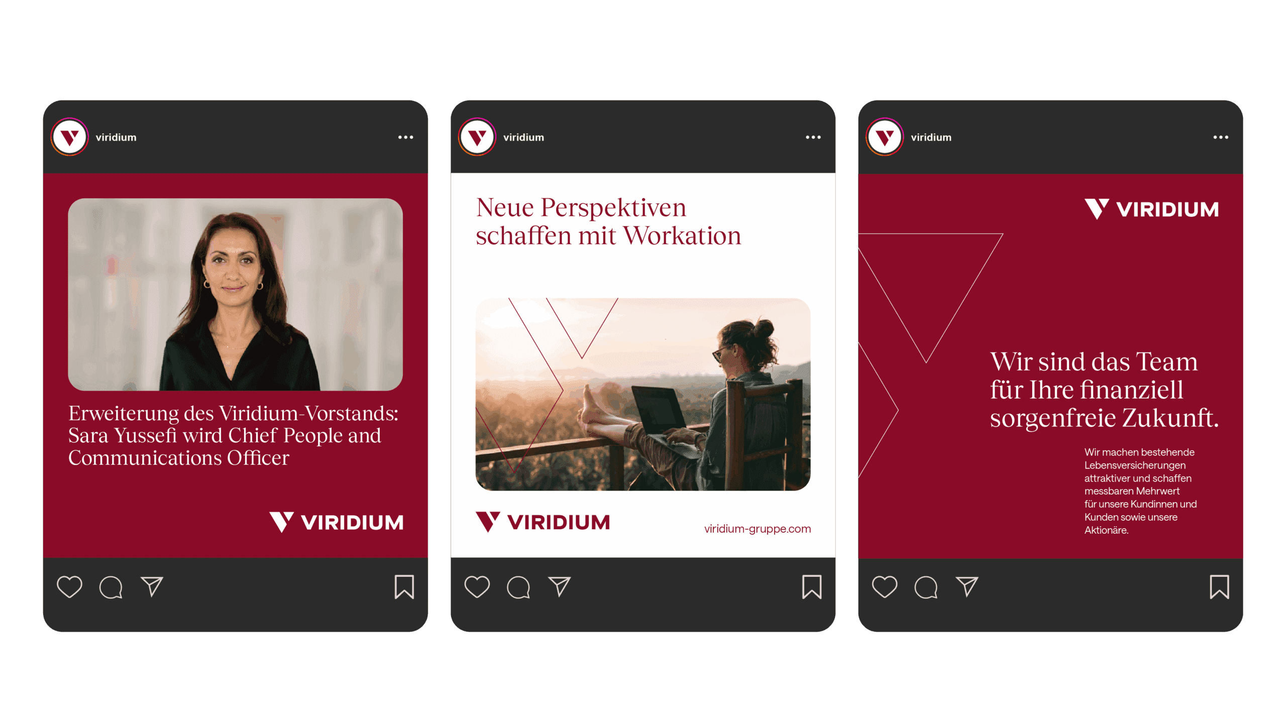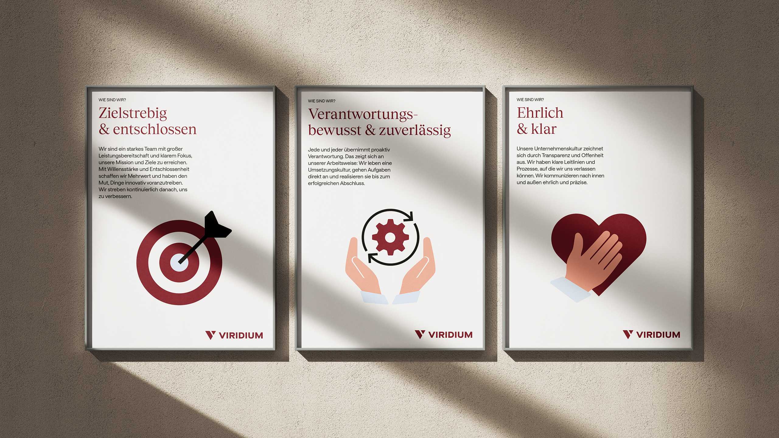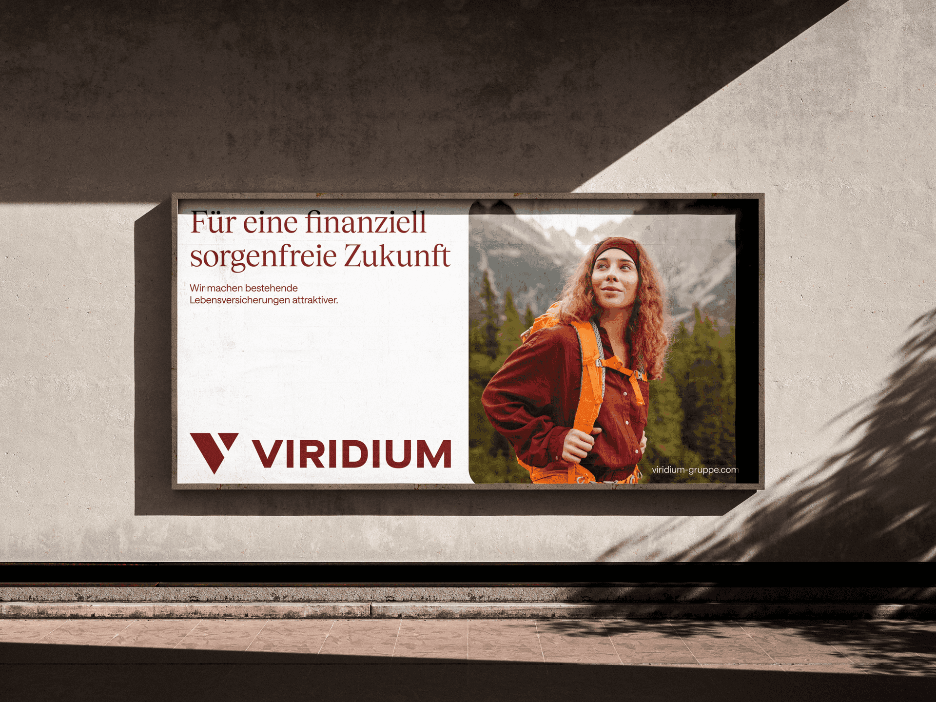 We put our heads together with the Viridium bods to sketch out what the rebrand would entail: everything from pinning down the corporate philosophy to honing the various facets of the brand to exploring a new visual language. The key was to determine exactly what Viridium stands for in clear, simple terms, namely: trust, reliability and a focus on making life insurance policies as attractive as possible for customers. From here, we rebuilt the brand strategy from the ground up in order to place the focus firmly on the company’s principles – making it clear to employees and customers alike what they can expect from Viridium.