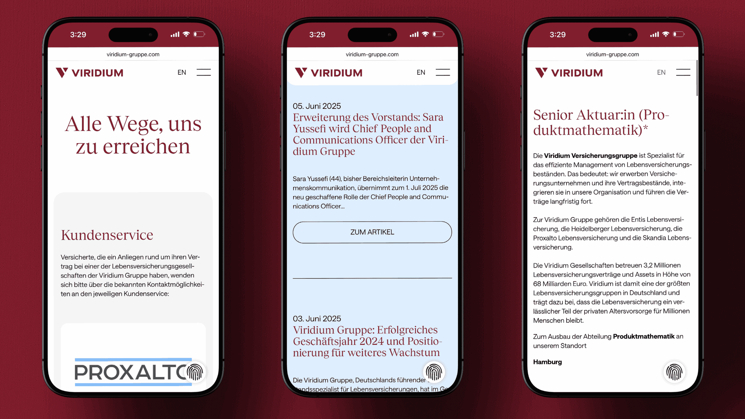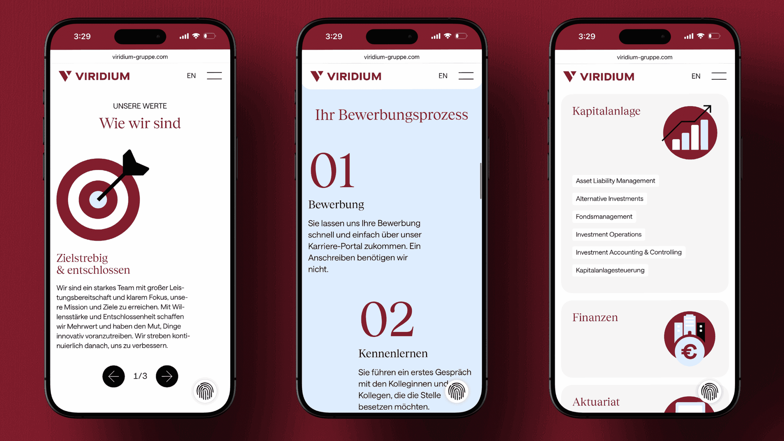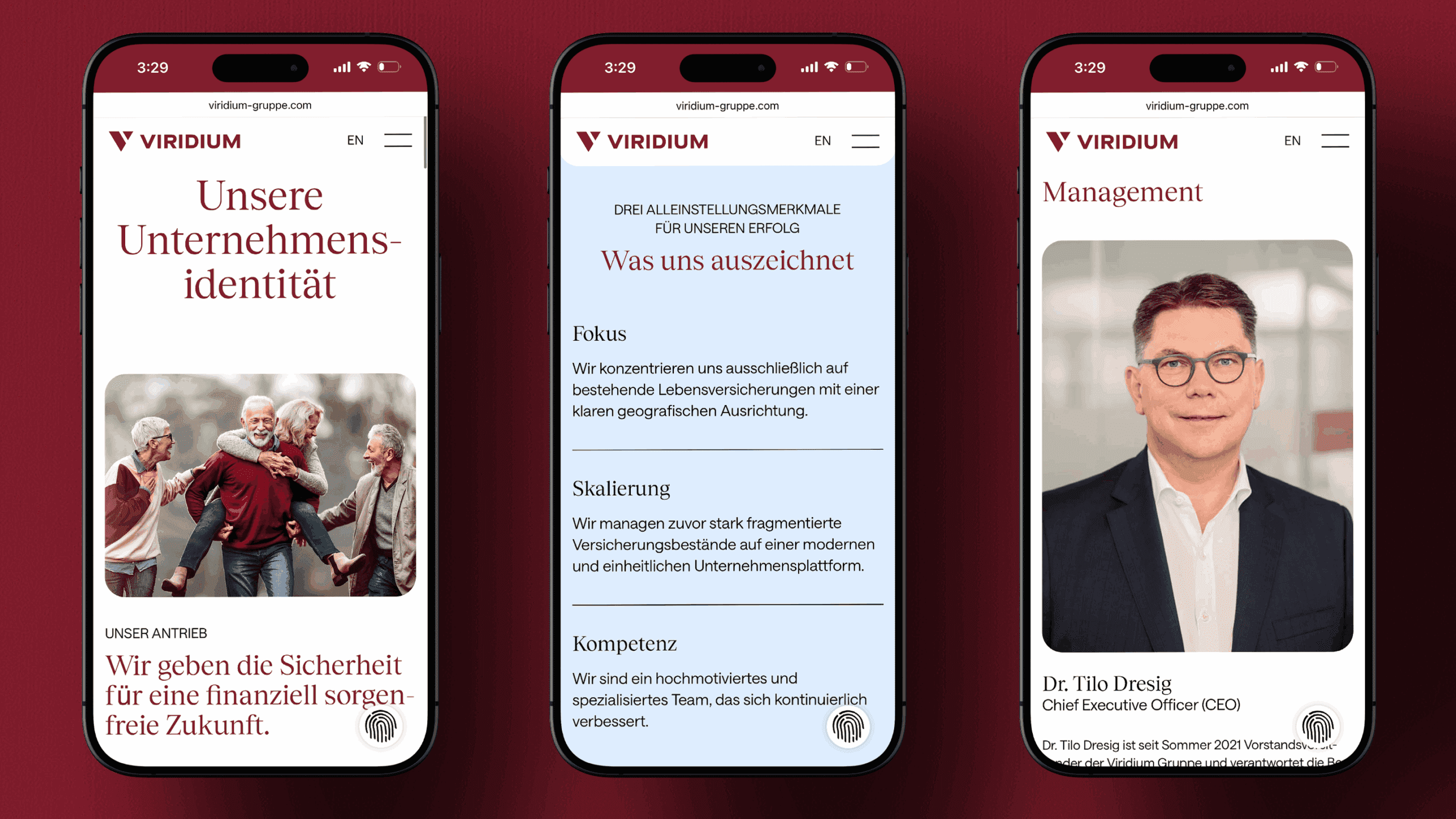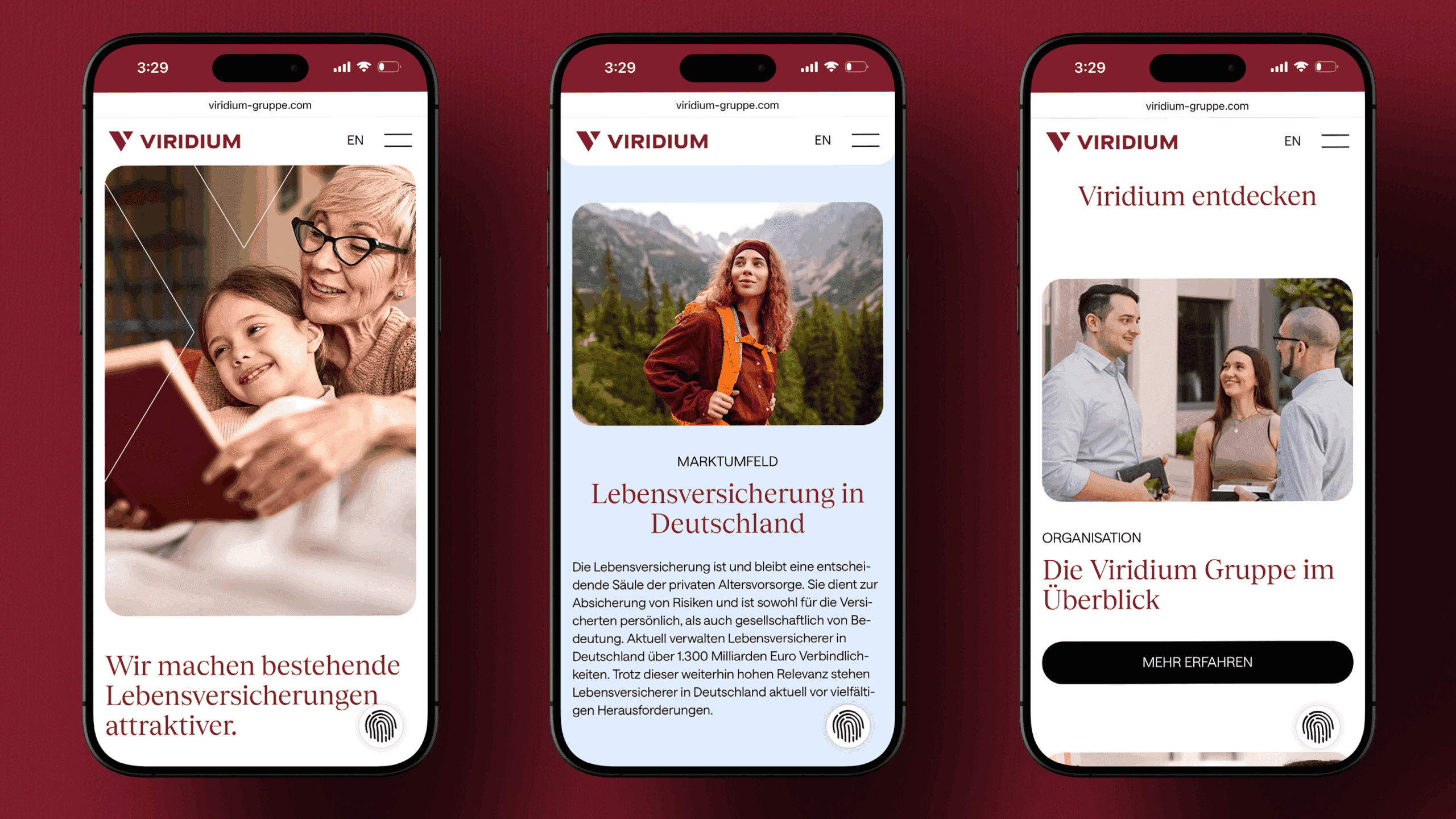 Having grown so big so quickly, Viridium’s corporate identity couldn’t keep pace. The brand lacked a visual cutting edge and was overlooking the USPs that make Viridium such a key partner in the life insurance segment. What the Group needed was a corporate identity that consolidated its customer-centric, trustworthy brand philosophy while being consistent across all touchpoints. The website in particular was in need of a new lease of life, with the outdated appearance not doing justice to Viridium’s very attractive market services. Like all leading names, the company has a story to tell – but the world needs to see it to understand it.